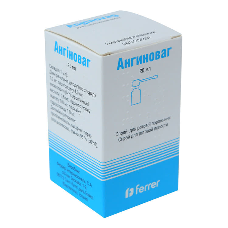 Ангиноваг спрей 20мл | Испания | 2 960 руб. | 1 флакон, который содержит 20мл спрея |