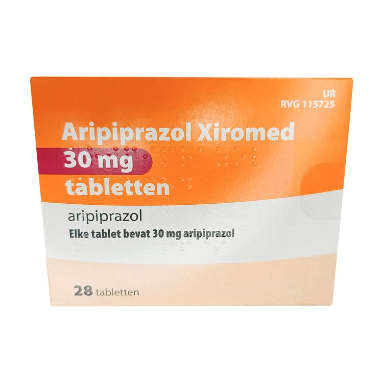 Препарат упакован в картонную коробку, оформленную в фирменном стиле производителя Xiromed. На лицевой стороне указано название «Aripiprazol Xiromed», дозировка «30 мг» и количество таблеток «28».