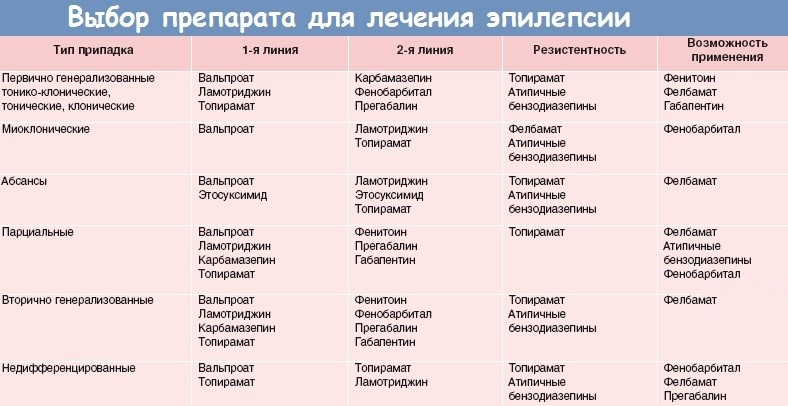 Противосудорожные препараты делятся на два вида: первая линия (медикаменты, с которых начинается лечение) и вторая линия (медикаменты, используемые при неэффективной терапии первой линии).