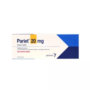 Париет таб. 20мг №28. Его прием подавляет секрецию соляной кислоты независимо от раздражителя. Лечение Париетом помогает не допустить появления болезненной симптоматики язвы.