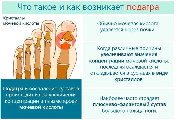Подагра – это болезнь суставов, которая возникает при нарушениях белкового обмена в организме. Во время развития недуга в крови повышается уровень мочевой кислоты, которая, при накоплении в организме, кристаллизуется и образует мочекислые соли. Эти соли откладываются на сухожилиях и суставах.