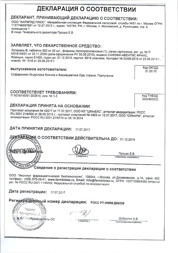 Прежде чем купить Эспераль 500мг в ближайшей аптеке, нужно обязательно проконсультироваться с врачом. Самолечение опасно для Вашего здоровья.