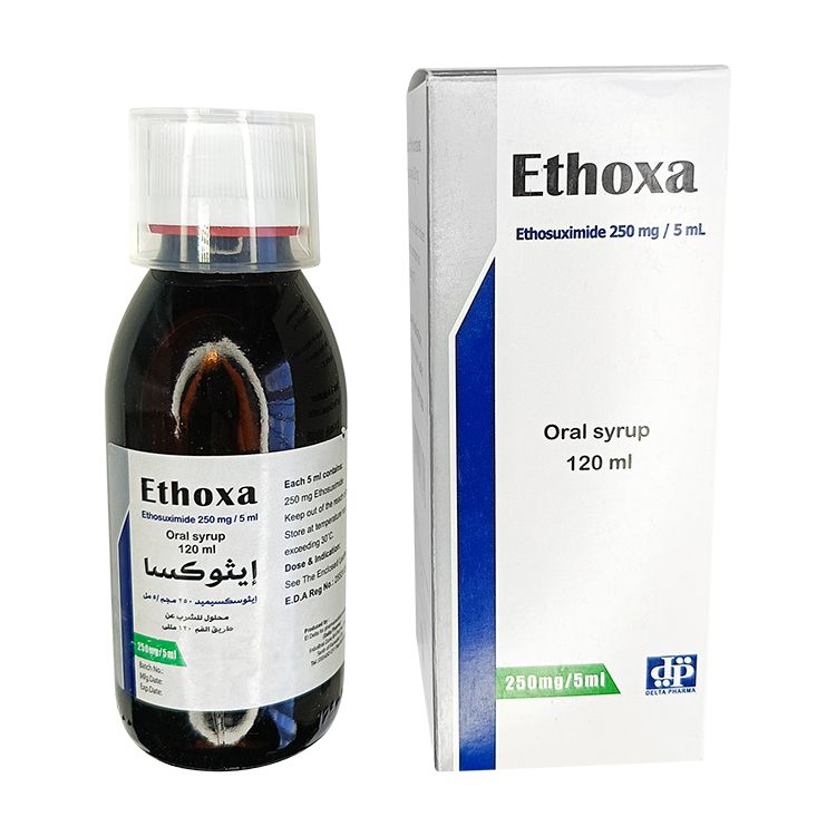 Ethoxa — это противоэпилептический препарат,содержащий этосуксимид (ethosuximide). Принадлежит к классу сукцинимидов и применяется главным образом для профилактики абсанс- (петит-мал) судорог у детей и взрослых. Сиропообразная форма облегчает точное дозирование и повышает приверженность терапии, особенно у лиц, которым трудно глотать таблетки.