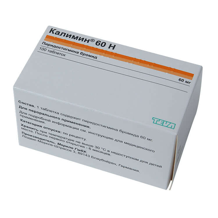 Калимин 60 н применяется для лечения миастении, миорелаксации, купирования миастенического синдрома, борьбы с атонией кишечника, мочевого пузыря, двигательными нарушениями, которые возникли в результате травмирования, осложнений после полиомиелита и других заболеваний. Препарат назначают также в случаях передозировки антихолинергических лекарственных средств или недеполяризующих миорелаксантов. Основной действующий компонент препарата Пиридостигмина бромид тормозит активность холинэстеразы (фермента, который расщепляет ацетилхолин). Повышение количества ацетилхолина обеспечивает улучшение передачи возбуждения в нервной системе. В результате повышаются эффективность нервно-мышечной передачи, секреция эндокринных желез, тонус бронхов, усиливается моторика ЖКТ, улучшается опорожнение мочевого пузыря.