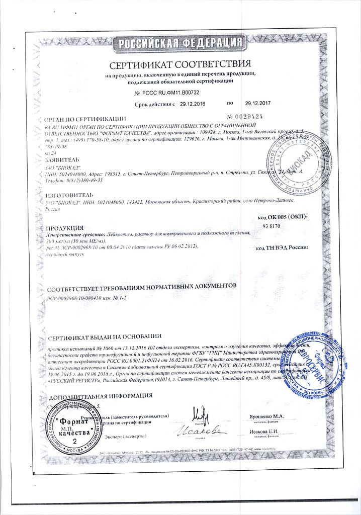 Активный компонент – это очищенный протеин, который состоит из 175 аминокислот. Вырабатывается кишечной палочкой, в геном которой введен ген человека.