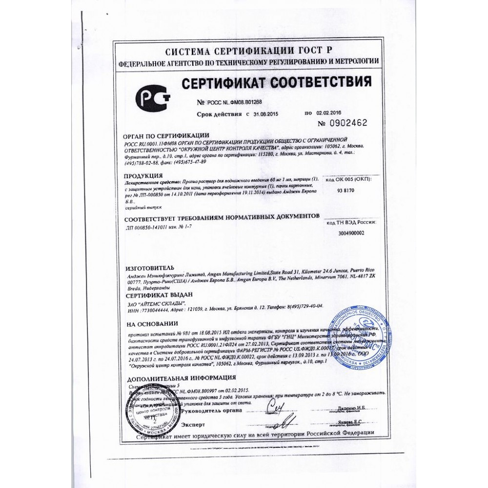 - Официальная инструкция от производителя Amgen Europe B.V. Нидерланды