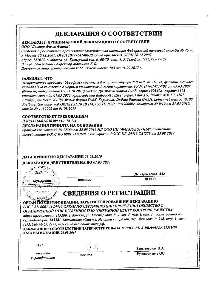 При одновременном приеме кислото-супрессоров, таких как омепразол, может снижаться эффективность активного вещества препарата Урсофальк. А сочетание с другими желчегонными препаратами может усилить его действие, что увеличивает риск развития побочных реакций.